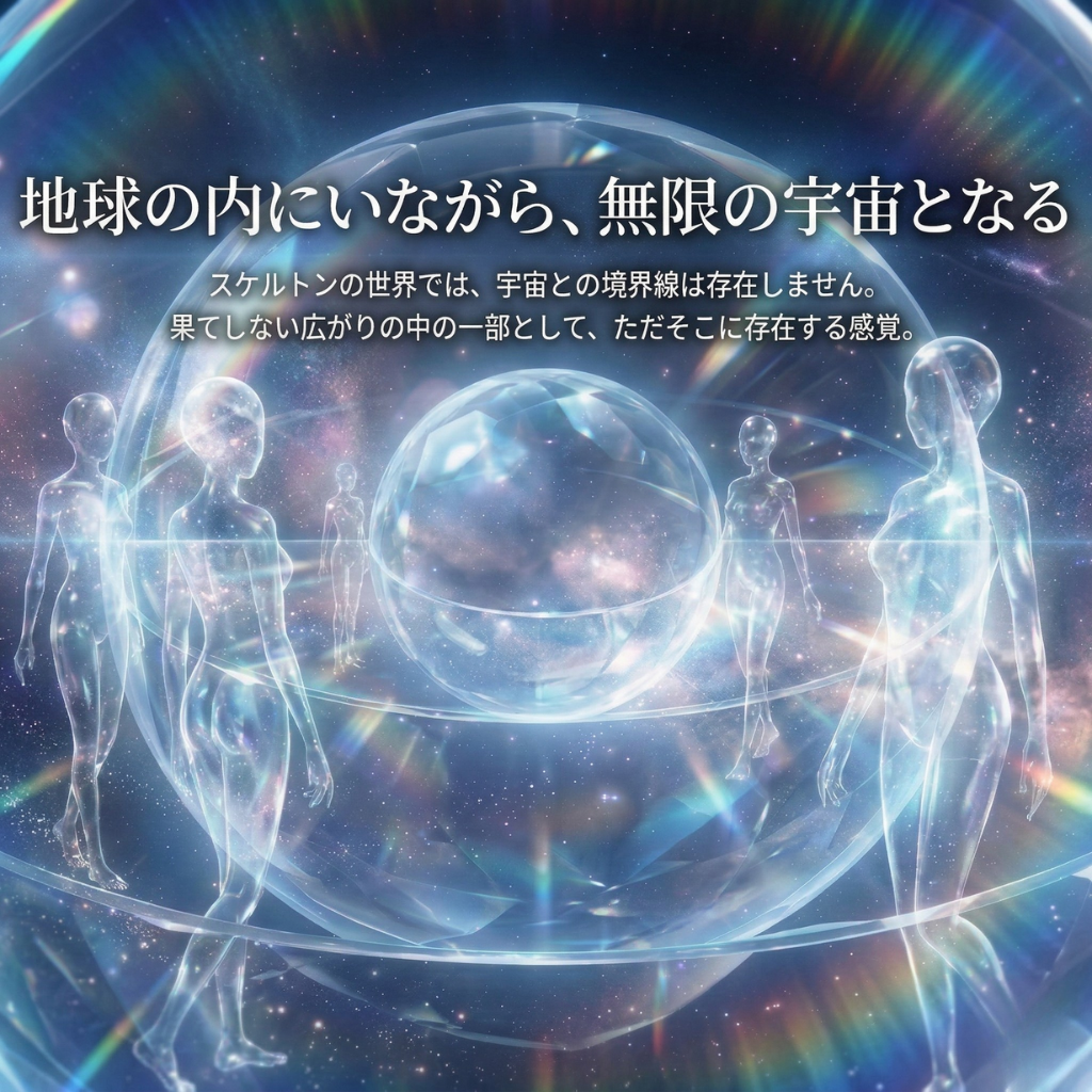 地球の内側から外(宇宙)を眺める「スケルトン・ビュー」。自身を照らし、他者をも輝かせる「手鏡(ハンドミラー)」のワークは、理屈抜きに純粋で無邪気な「生き生きとした喜び」を呼び覚まします。